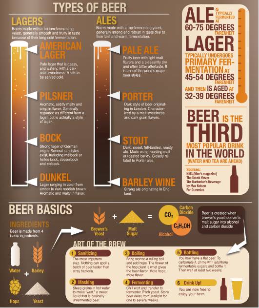 Basically, there are two kinds; lagers and ales. The difference is in the yeast fermentation style, bottom for lager and top for ale. Different "recipes" will change the flavor. Some have lots of hops, while others are fruity or sweet. Here's a simple description: