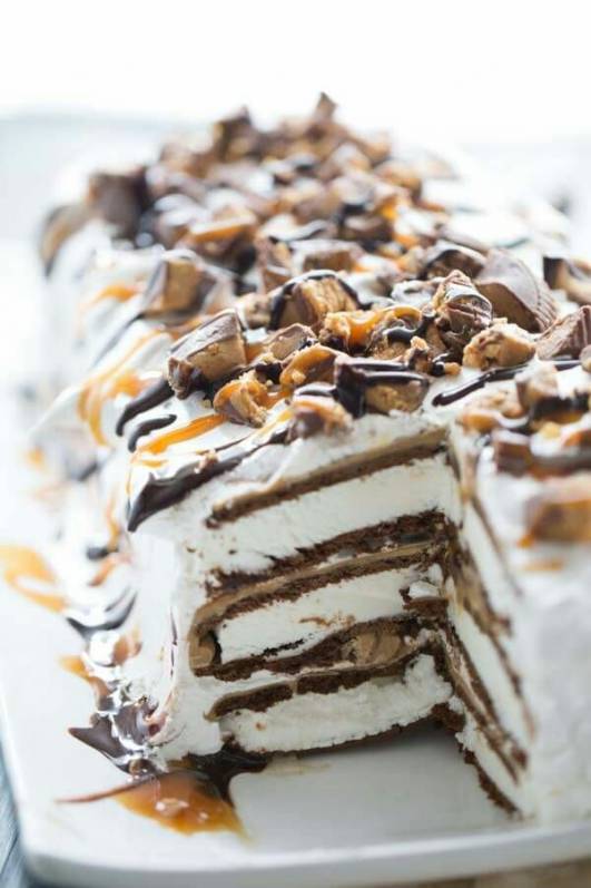 An ice cream sandwich cake in the freezer.