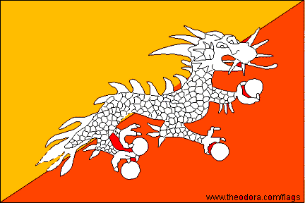 The flag of Bhutan is consisted of two right-triangles, the color of them are orange and red. There is a Thunder Dragon at the center of the flag. It was officially introduced in 1956.